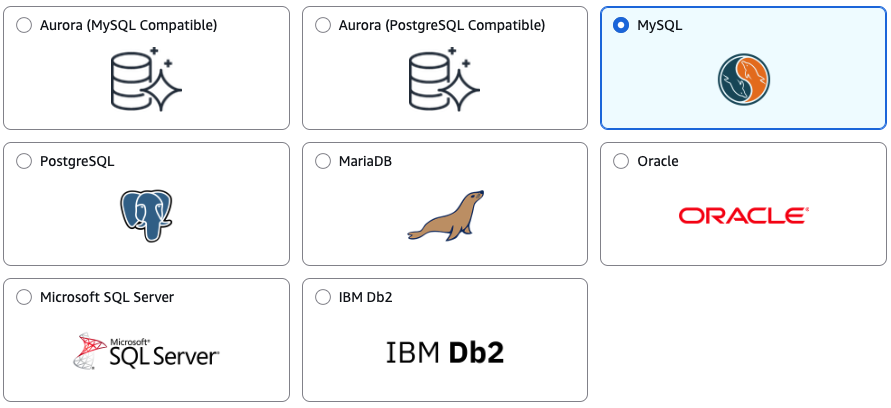 RDS에서는 Amazon Aurora, MySQL, PostgreSQL, MariaDB, Oracle, Microsoft SQL Server, IBM Db2 를 지원하고 있다.