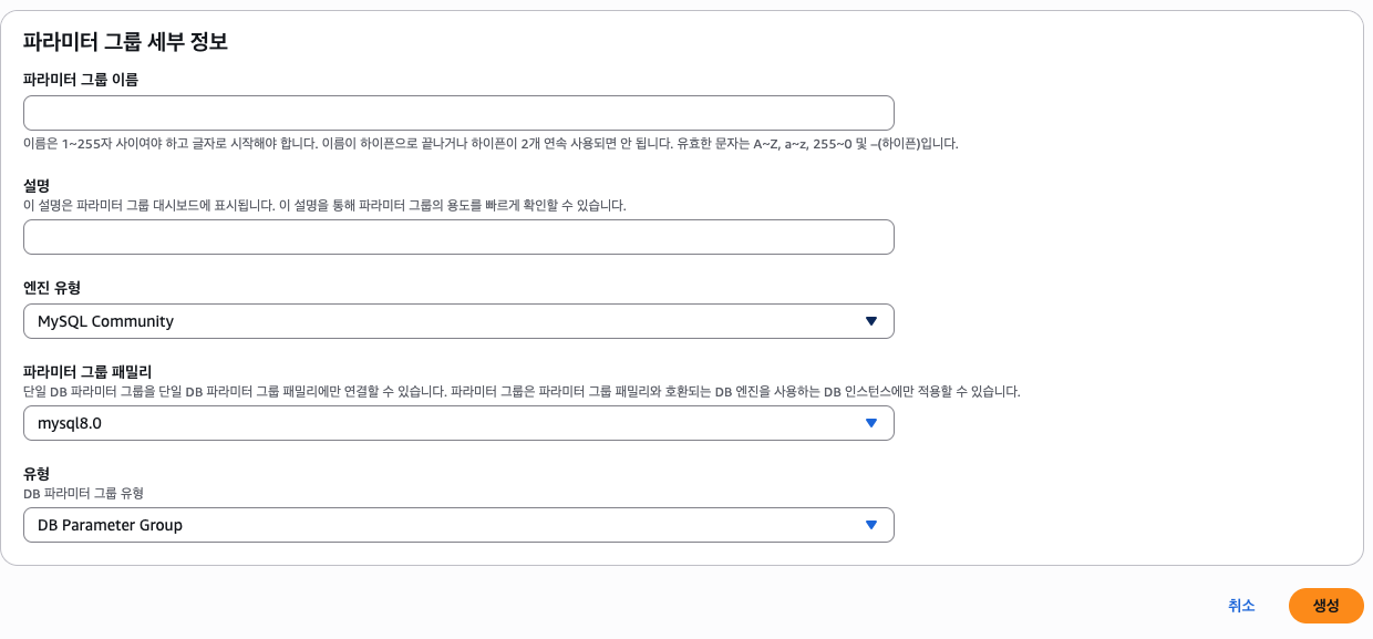 AWS에서 관리하는 RDS 인스턴스에 직접 접속해서 환경을 설정할 수 없기에 파라미터 그룹을 통해 환경 설정을 해야한다.